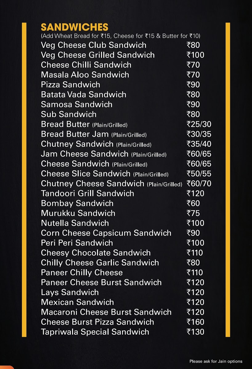 - Tapriwala Specials: Explore exciting dishes such as Pav Bhaji, Cheese Pav Bhaji, and Veg Momos, all carefully crafted to tantalize your taste buds.